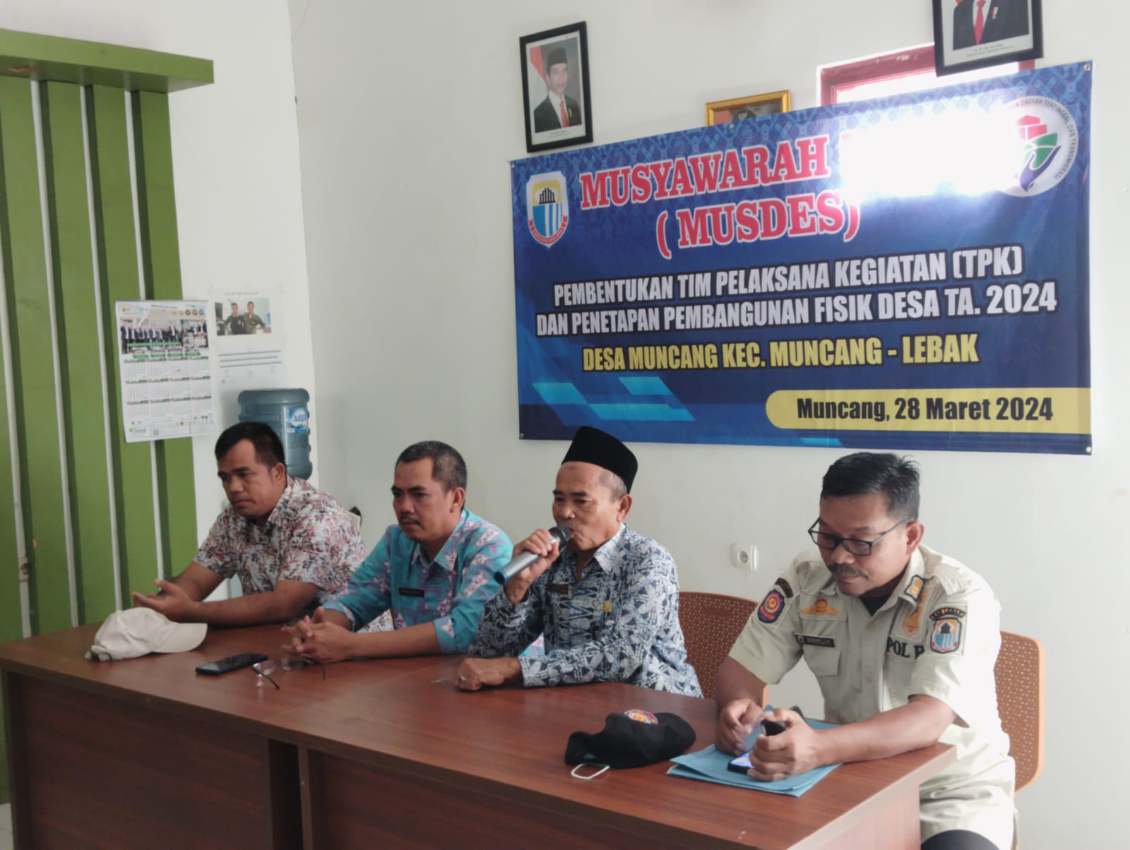 LEBAK, CatatanmMediiaNusantara – Pemerintahan Desa (Pemdes) Muncang menggelar kegiatan Musyawarah Desa (Musdes) Dalam melaksanakan ketentuan Peraturan Bupati Lebak nomor 21 tahun 2022 tentang tata cara pengadaan barang/Jasa di Desa, pada Pasal 12 tentang Tim Pelaksanaan Kegiatan (TPK) pembangunan fisik/Insfrastruktur Desa Tahun Anggaran 2024, di Desa Muncang, Kecamatan Muncang, Kabupaten Lebak – Provinsi Banten. Kamis (28/3/2024).