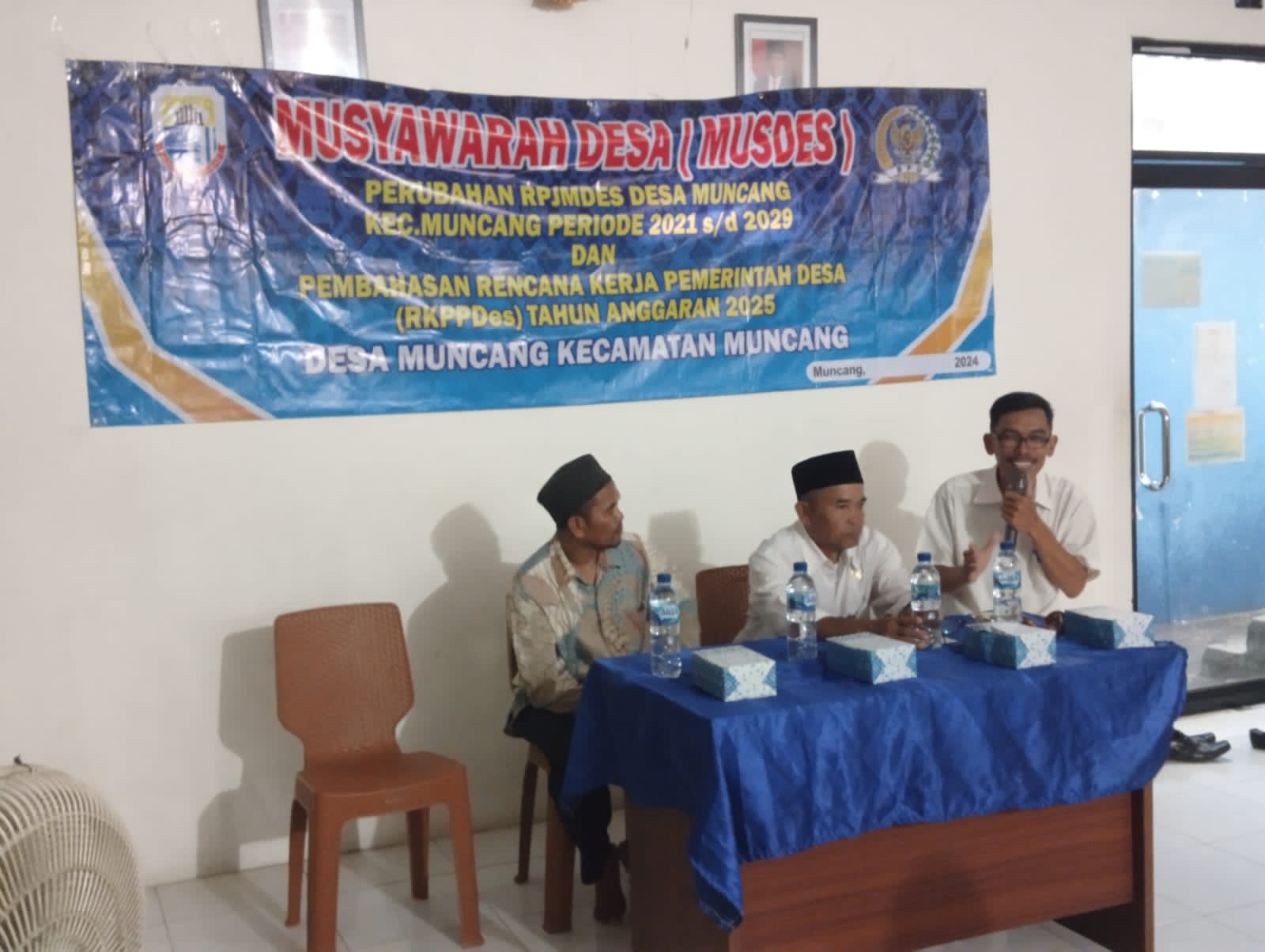Acara di gelar di Aula Kantor Desa Muncang pada Rabu 16 Oktober 2024 pukul 08.30 WIB s/d selesai. Musdes ini dihadiri yakni, Kepala Desa Muncang Abeng beserta seluruh Parades, Babinmas, Babinkamtibmas, Kasi pemerintahan (Kaspem) Asikin Widi Jatmika S.Pd, Edih Lesmana, S.Ap Kasi Ekbang Kecamatan, PLD, RT/RW, Ketua BPD beserta anggota, Perwakilan Kader Posyandu, Perwakilan Paguyuban Guru Paud, Tokoh masyarakat, Tokoh pemuda, Tokoh agama, Tokoh pendidikan, LPM, Karangtaruna desa.