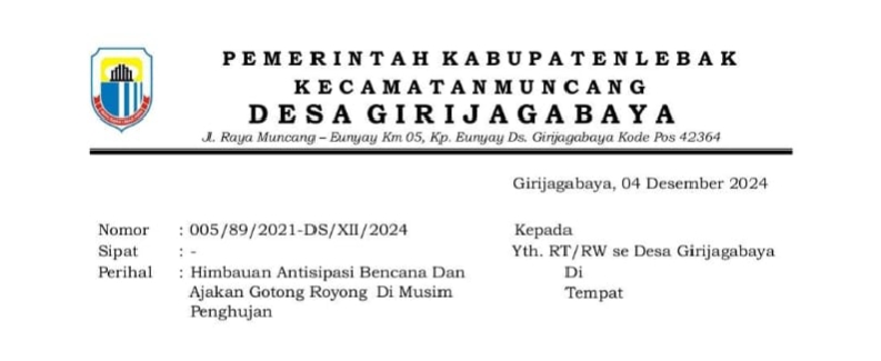 LEBAK, CatatanMediaNusantara – Pemerintah Desa Girijagabaya, berikan himbauan antisipasi bencana dan sekaligus mengajak gotongroyong kepada RT / RW agar menyampaikan kepada para warga yang berada di wilayah Desa Girijagabaya, Kecamatan Muncang, Kabupaten Lebak – Banten, mengingat sekarang sudah berada di musim penghujan, Selasa, (3/12/2024).