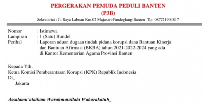 Dalam pelaporan tersebut, kata Arip, P3B sudah membuat surat laporan pengaduan dugaan tindak pidana korupsi dana BKBA Tahun Anggaran 2021, 2022 dan 2024, yang ada di Kementerian Agama Provinsi Banten.