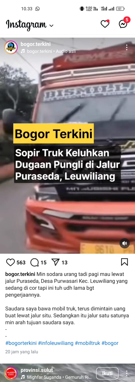 Kapolsek Leuwiliang Kompol Agus Supriyanto,.SH,.MH menjelaskan bahwa Hasil penyelidikan dari pihak Polsek Leuwiliang Bhabinkamtibmas dan aparat desa Puraseda, juga Bhabinsa Koramil Leuwiliang ternyata berita viral tersebut adalah *tidak benar alias HOAX*, sumber informasi dari orang yang membuat video Viral dimaksud langsung dari Sopir Truk dan akhirnya Sopir Truk Tersebut membuat video permintaan maaf yang dibuatnya sendiri.