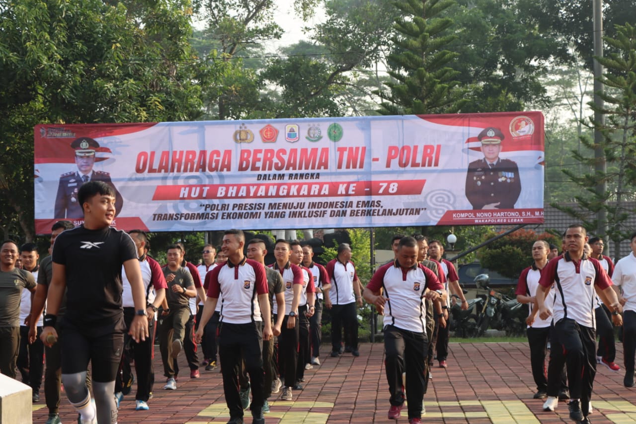 Lebak, Jelang HUT Bhayangkara ke-78, Polres Lebak Polda Banten menggelar Olahraga Bersama TNI-POLRI dan Forkopimda Lebak di Lapangan Mapolres Lebak. Jum’at (21/6/2024).