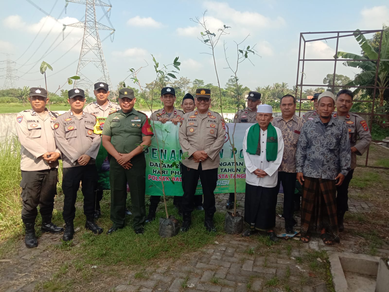 Tangerang, Kapolsek Balaraja Polresta Tangerang AKP Badri Hasan Pimpin Personilnya melaksanakan kegiatan Penanaman Pohon Halaman kantor Kecamatan Sukamulya dalam rangka peringatan ke 78 Hari Bhayangkara tahun 2024 menuju Indonesia Emas pada Kamis( 27/06/2024)